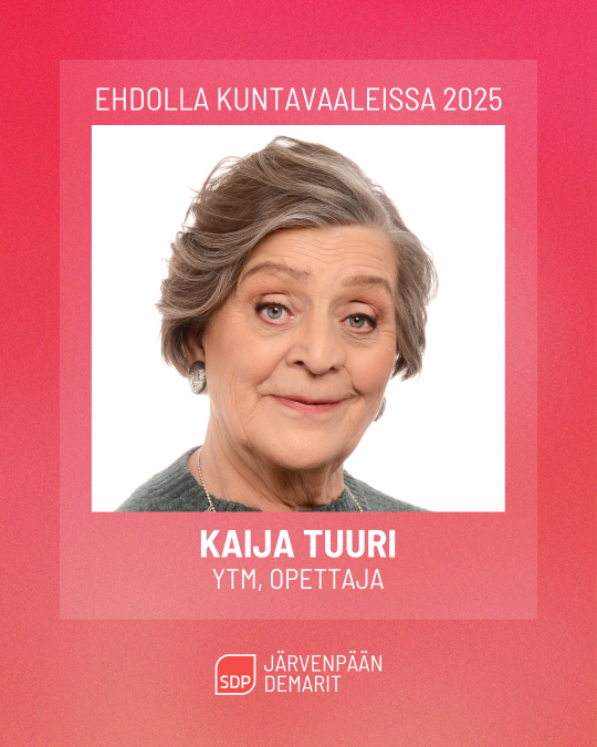 Ehdolla kuntavaaleissa Etunimi ja sukunimi: Kaija Tuuri Ammatti, koulutus ja mahdolliset luottamustoimet: YTM, opettaja (eläkkeellä), Uudenmaan demarinaisten hallituksen jäsen, Senioriopettajien edustaja eläkeläisneuvostossa, Etelä-Suomen klubitalot ESKOT ry:n hallituksen jäsen, Lion’s club Vennyt ja Jussit hallituksen jäsen, Järvenpään taidemuseon ystävät ry:n hallituksen…