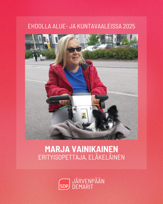 Etunimi ja sukunimi: Marja VainikainenEhdolla alue- ja kuntavaaleissa Ammatti, koulutus ja mahdolliset luottamustoimet: Erityisopettaja, aiemmin olen toiminut Järvenpäässä hyvinvointilautakunnan varapuheenjohtajana ja Järvenpään veden hallituksen jäsenenä, olen myös ollut Etevan varapj aiempana kautena. Asuin korona-ajan Imatralla ikääntyneiden vanhempieni lähellä auttaen heitä.…