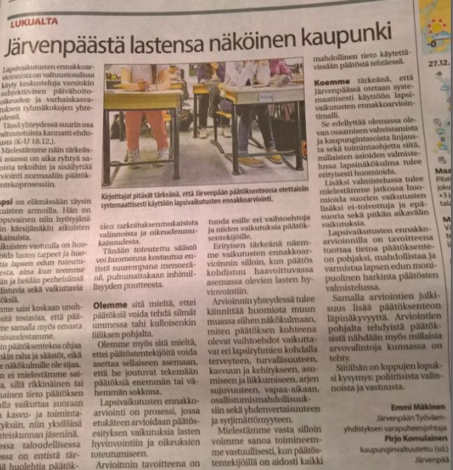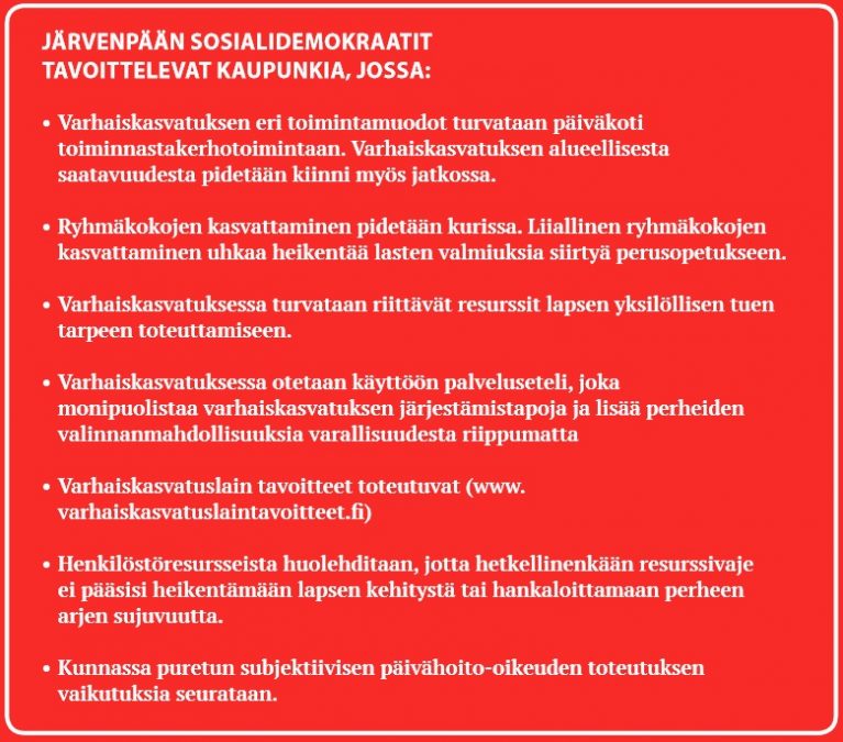 Järvenpää on kulttuurikaupunki, jossa kuntalaisilla on mahdollisuus tehdä, kokea ja nähdä kulttuuria erilaisten tapahtumien, näyttelyiden ja tilaisuuksien muodossa. Tuusulanjärven alueen taiteilijayhteisön perinne velvoittaa Järvenpäätä tavoittelemaan myös jatkossa alueen vetovoimaisimman kulttuurikunnan asemaa. Kuntalaisille tulee tarjota mahdollisuus paitsi kokea ja nähdä kulttuuria,…