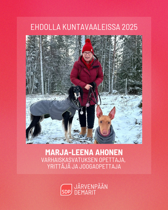 Hei, olen Marja-Leena Ahonen 69v ja olen Järvenpäässä kuntavaaliehdokkaana. Muutin tänne neljä vuotta sitten ja olen tyytyväinen valintaani. Asun keskustan tuntumassa Pöytäalhon alueella. Täältä olen löytänyt sopivasti pikkukaupungin tuntua ja riittäviä palveluita. Elämääni tässä ja nyt kuuluvat kuvassa näkyvät salukilady Rauha ja etnakoiraIlona. Harrastan pitkiä kävelylenkkejä ja koiraurheilua juoksukisojen muodossa. Minulla on onni olla myös sympaattisen aikuisen pojan äiti. Olen sekä lempeä että voimakas ihminen. Kun tartun asioihin, en lannistuvastatuulesta, vaan uskon että tästäkin seuraa jotakin hyvää.