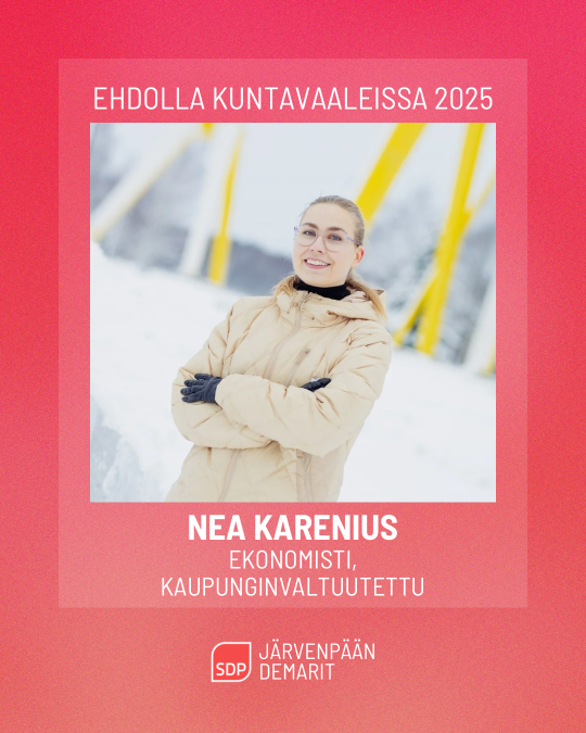 Olen asunut Järvenpäässä suurimman osan elämästäni ja sukuani asuu Järvenpäässä monessa sukupolvessa. Pidän siitä, että täällä on tiiviissä paketissa kaikki tarvittava. Kuluva valtuustokausi on ollut minulle ensimmäinen kaupunginvaltuutettuna ja entisestään vahvistanut halua olla osallistumassa kaupungin kehittämiseen vielä parempaan suuntaan.