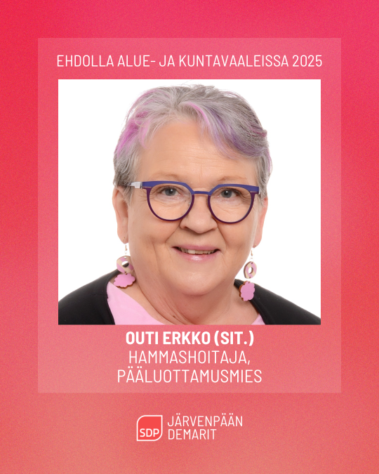 On tärkeää, että jokaisella on mahdollisuus saada laadukkaita terveys- ja sosiaalipalveluita julkiselta sektorilta. Palvelut tulee olla helposti ja joustavasti saatavilla, unohtamatta heitä, jotka kokevat lisääntyneet digipalvelut haastaviksi. Haluan olla mukana varmistamassa, että kukaan ei jää yksin eikä saa tarvitsemiaan palveluita. Kehitetään Järvenpäästä yhdessä turvallinen ja elinvoimainen kaupunki asua!
